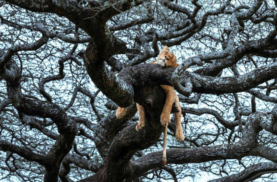 Na území afrického národního parku Serengeti údajně žijí zhruba tři tisíce lvů. Všímavý pozorovatel je tudíž může zachytit nejen při lovu, ale také během odpočinku. Atzmon Dagan takto například zvěčnil lvici podřimující ve větvích akácie. (foto: EPA, Atzmon Dagan)