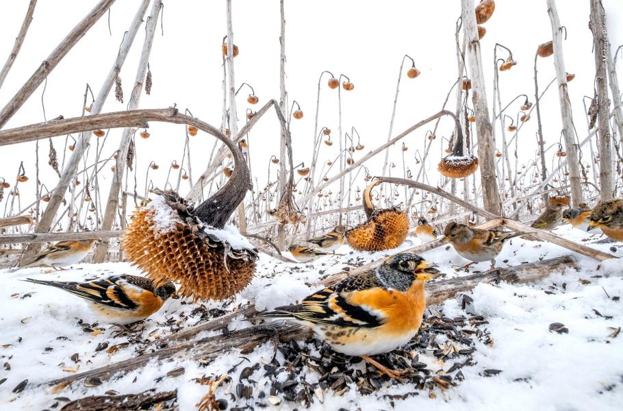 Část zvěčněného slunečnicového pole se kvůli povodním nepodařilo sklidit, tudíž zůstalo ladem. V zimě se pak proměnilo v ráj drobného ptactva – například pěnkav, které přilétaly hodovat na výživných semínkách. (foto: EPA, Mateusz Piesiak)
