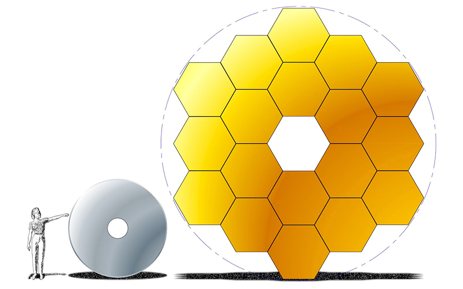 Porovnání velikosti zrcadel HST a JWST (foto: NASA, CC0)