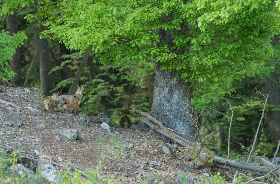 Přibližně po půl hodině čekání jsem mezi stromy zahlédla pohyb. Zdálo se mi, že pod větvemi proběhlo lišče a přibližně za další dvě minuty jsem ho zahlédla zcela zřetelně. Pak se objevilo na malém volném prostranství mezi stromy a za ním postupně vylézala další. Nevím, kolik jich bylo přesně, ale pohromadě byla k vidění vždy nejvýš tři. Chvíli si spolu hrála, pak na čas zmizela a po chvíli se někde znovu vynořila. Na cvakání závěrky fotoaparátu naštěstí nereagovala a moje inkognito zůstalo zachováno. Všude byl klid, jen v korunách stromů zpívali ptáci.