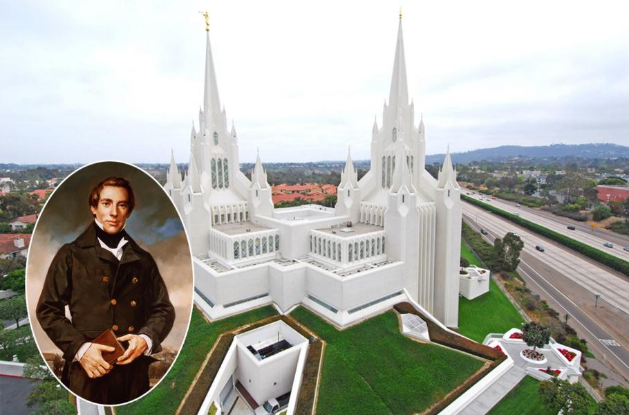 Mormonské chrámy se pyšní okázalostí, vstup do nich je však výsadou jen vhodných adeptů. Na snímku mormonský chrám v San Diegu. Ve výřezu zakladatel církve mormonů Joseph Smith.