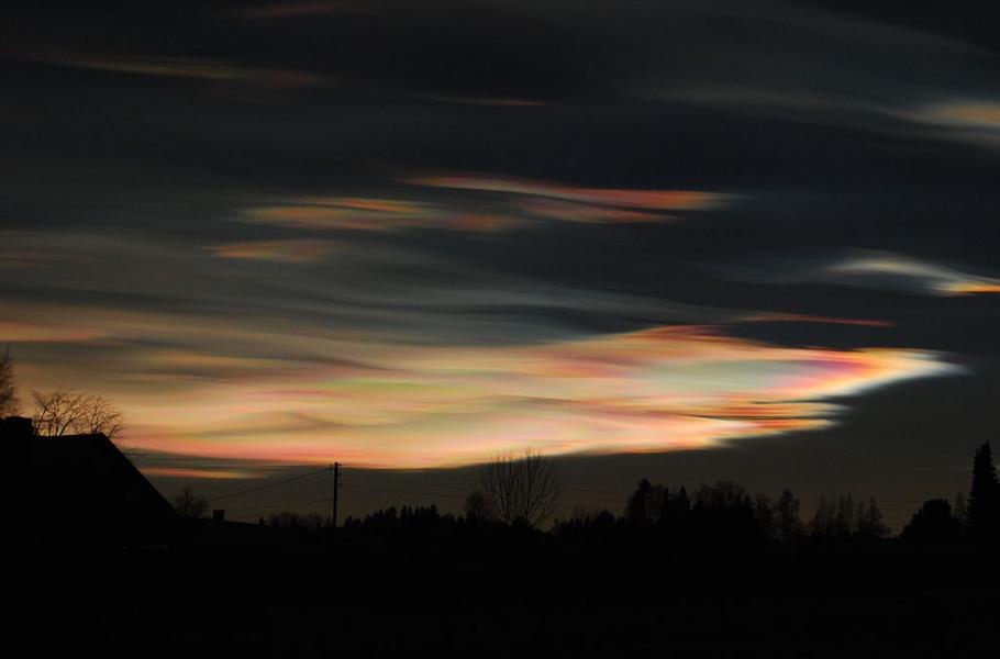 Perleťová oblaka nad jižním Norskem, prosinec 2014. (foto: Wikimedia Commons, Honzach, CC BY-SA 4.0)