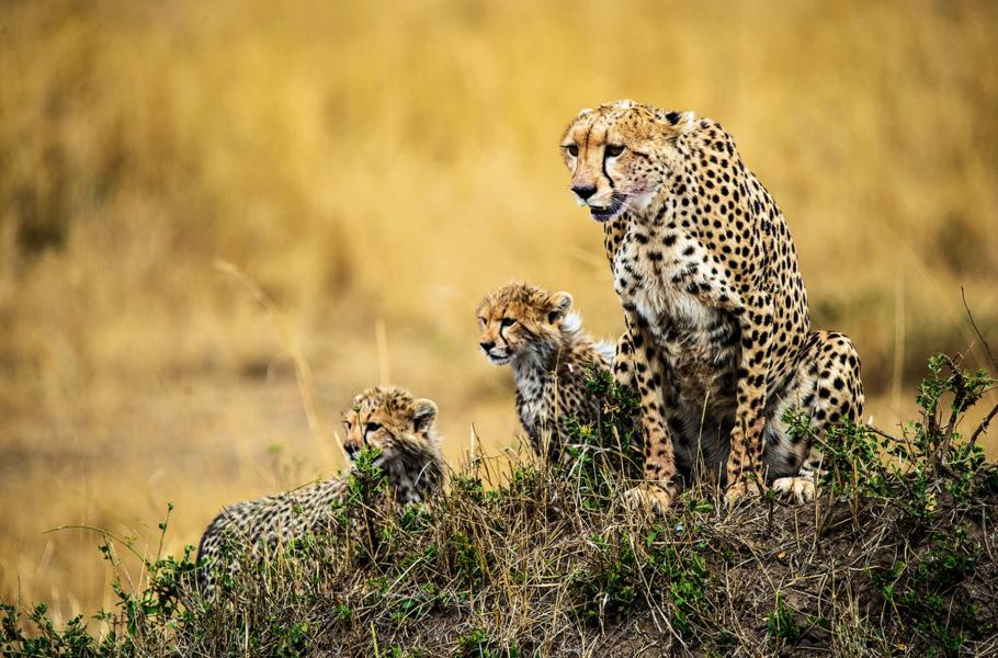 Gepardice Malajka s mláďaty. Rezervace Masai Mara je bohatá na vodní zdroje i zvěř a velkým kočkám se tam relativně daří.