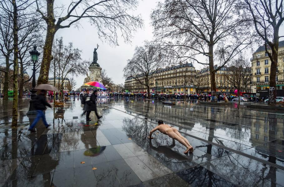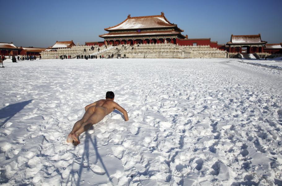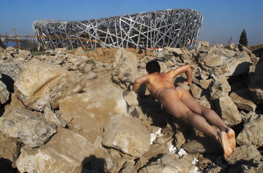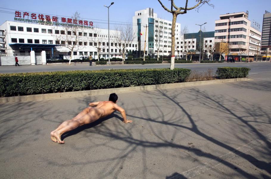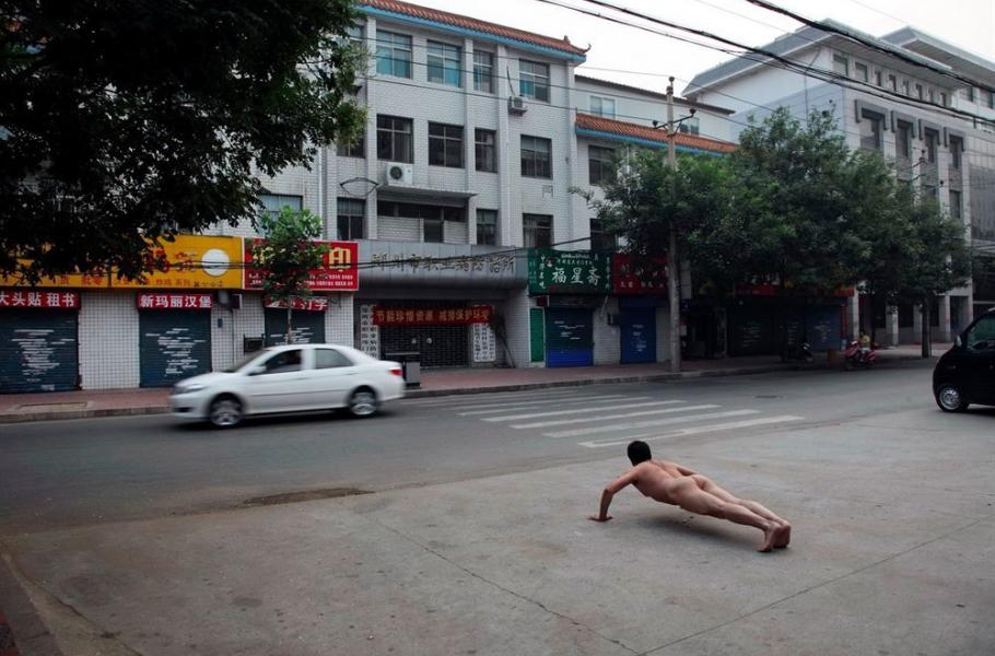 Čínský umělec Ou Č'-chang se již léta věnuje focení jedné velmi neobvyklé kompozice – sám zcela nahý pózuje v městských scenériích. Nejde ale o běžné městské akty – Ou Č'-chang na svých fotografiích dělá kliky v místech, které byly svědkem konkrétních společenských událostí současné Číny.