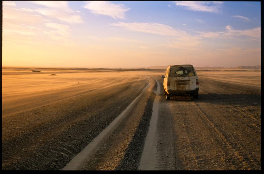 Nezpevněná, ale i běžným osobním autem dobře průjezdná silnice vede poměrně monotónní krajinou. Kamenitopísčité nekonečné plošiny, lemované na dalekém obzoru kostrbatými kopci, se místy vlní. Z barev převládá popelavě šedá a někdy se přimíchají okrové a zemité tóny.