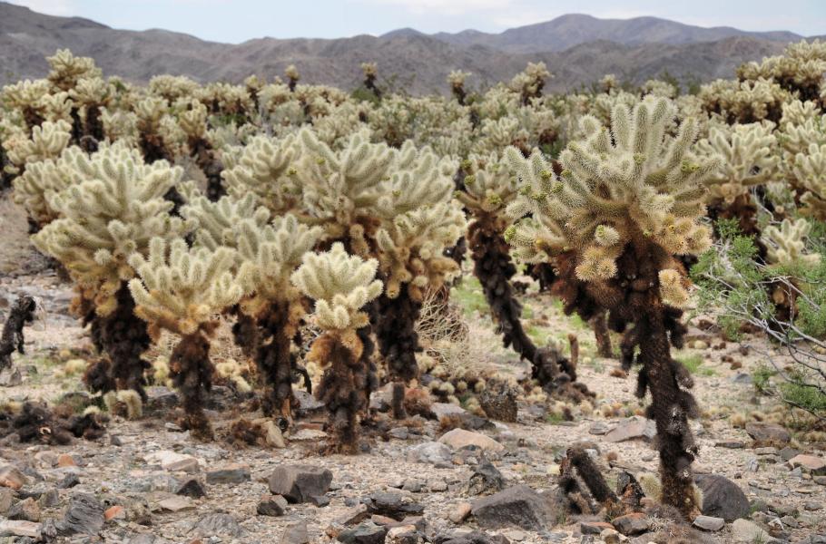 Na území parku o rozloze 3 200 km2 najdeme dvě pouště, které území ekosystémově rozdělují. Coloradská poušť na východě nepřesahuje nadmořskou výšku 900 metrů. Je teplá, ale vlhčí, s porosty keřů creosote (Larrea tridentata), ocotilla (Fouquieria splendens) a zejména nápadných a rádoby „přítulných“ kaktusů cholla (Cylindropuntia bigelovii), které jsou kvůli schopnosti nenápadně se přichytit na tělo přezdívány „jumping cactus“ tedy skákajíc kaktus. Vysoká hustota těchto rostlin udělala z místa „Cholla garden“ jednu z nejzajímavějších přírodních atrakcí parku.