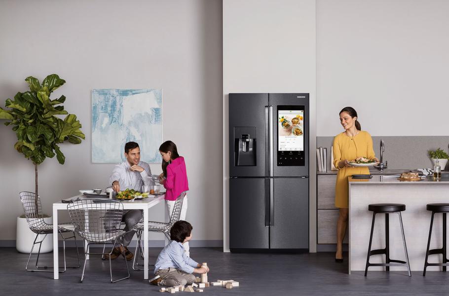 Samsung například letos v lednu představil druhou generaci svého Family Hubu: Obří lednice amerického typu má integrovaný počítač s velkým 10" displejem, který slouží jako domácí mediální centrum s kalendářem a hlasovým ovládáním, umí posuzovat stáří potravin a automaticky objednávat nové. Dokonce se díky třem vnitřním kamerám můžete přímo během nákupu na svém chytrém telefonu podívat, zda smetana v přihrádce je, nebo ji ráno někdo spotřeboval.