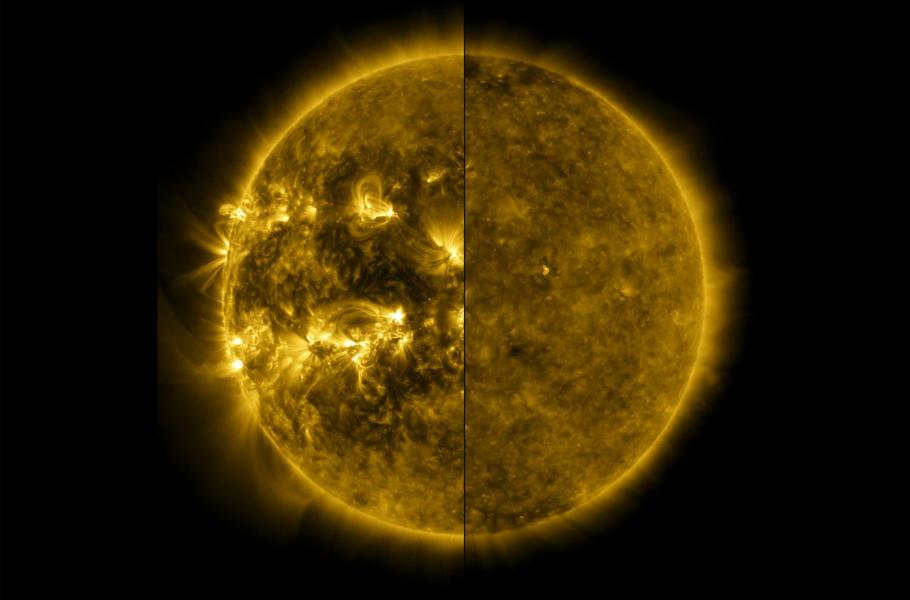 Vlevo Slunce v solárním maximu (duben 2014), vpravo Slunce v solárním minimu (prosinec 2019). (foto: NASA/SDO, CC BY-SA 4.0)