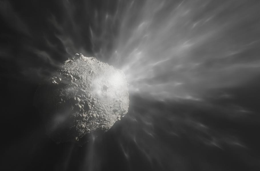 Ilustrace zachycuje výron oblaku trosek po impaktu sondy DART (NASA) na povrch planetky Dimorphos. Obrázek vznikl s pomocí detailních snímků planetky, které pořídila kamera DRACO na palubě sondy DART těsně před impaktem. (zdroj: ESO, M. Kornmesser, CC BY-SA 4.0)