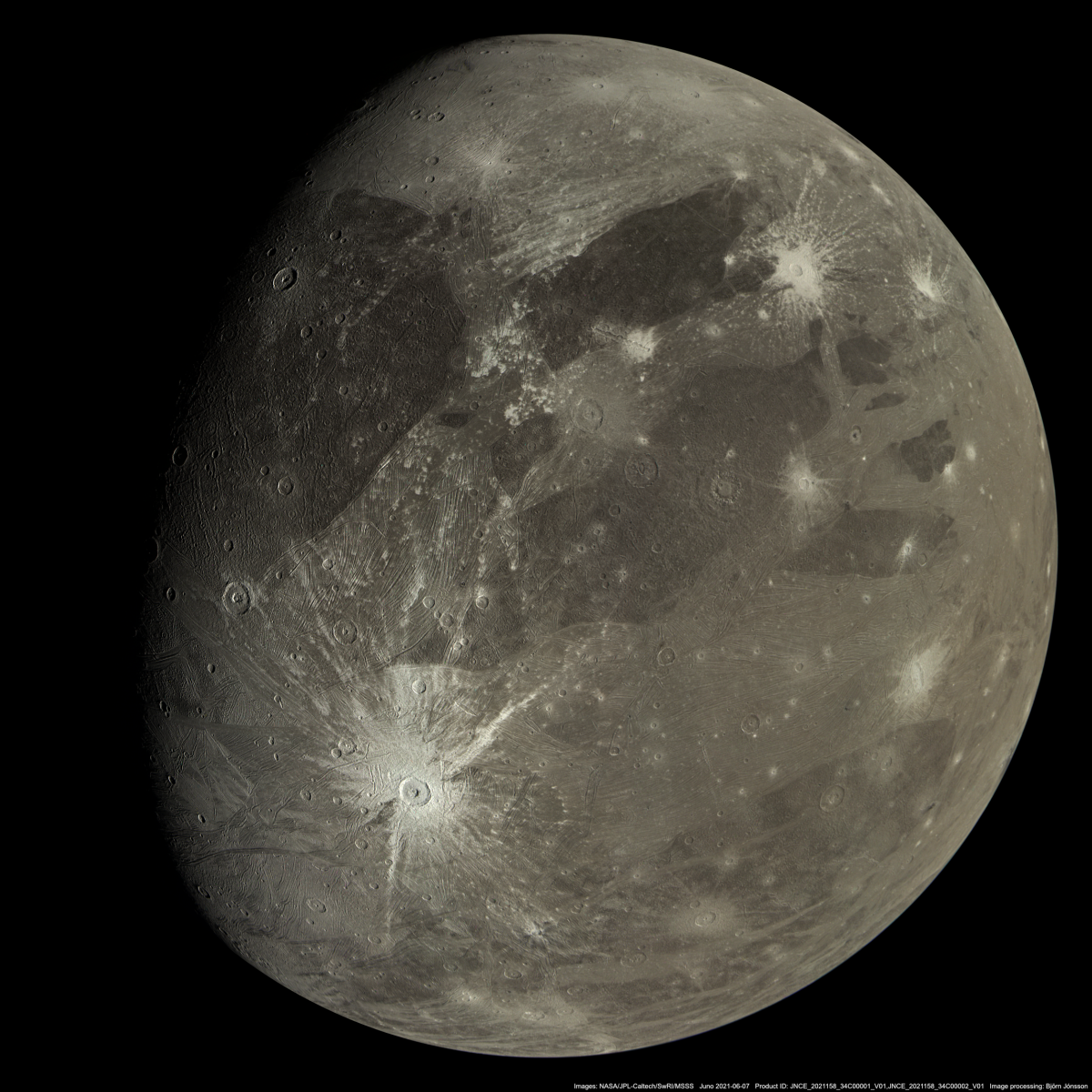 Po dlouhých 21 letech se pozemská sonda zaměřila na největší měsíc Sluneční soustavy. Během rychlého průletu pořídila sonda Juno několik fotografií Jupiterova měsíce Ganymedu