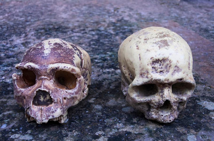 Srovnání lebek člověka heidelberského a dnešního člověka. Podle novějších teorií byl Homo heidelbergensis předchůdcm Homo neanderthalensis i Homo sapiens. (foto: Shutterstock)