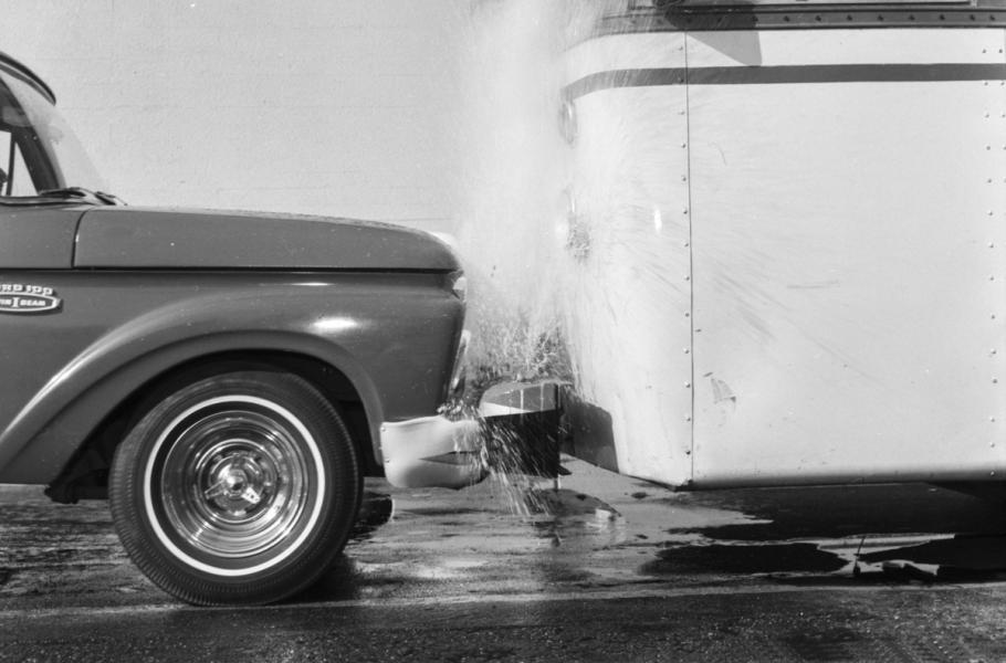 Drobné kolize při couvání končí většinou promáčknutým nárazníkem, který nijak nebrání pokračovat v jízdě. Ve Spojených státech se však v 60. letech minulého století testovaly bezpečnostní prvky, jež vydržely právě jeden kontakt s překážkou – plnily se totiž vodou. Tekutina náraz utlumila, vak se přitom protrhl a škody byly o něco menší. Problém spočíval v tom, že po každém „ťukanci“ muselo auto do servisu, aby se nárazník vyměnil. Vodní polštáře se proto instalovaly jen experimentálně a po sečtení nákladů na údržbu se od nich rychle upustilo. (foto: SFMTA Photo Archive, CC0)