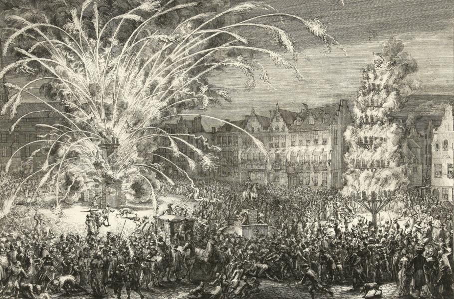 Ohňostroj uspořádaný v Bruselu při návštěvě římského císaře Leopolda I. roku 1686, rytina nizozemského malíře Romeyna de Hooghe. (ilustrace: Alamy)