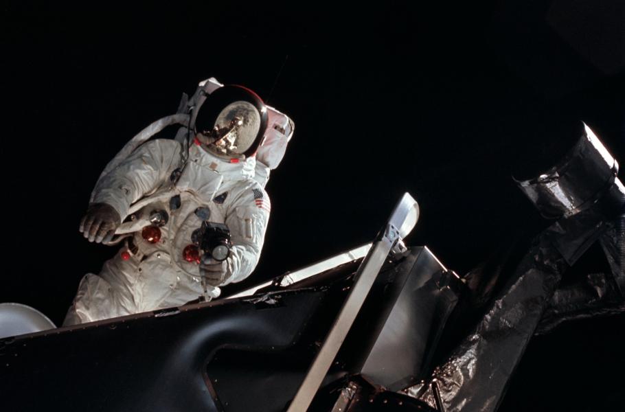 Ovšem hned první plánovaný výstup v rámci zmíněného programu Apollo v březnu 1969 při misi s číslem devět potkaly potíže. Během vycházky měl Russell Schweickart otestovat jednak lunární skafandr se zádovou jednotkou zajištění životních podmínek (do té doby používali Američané pro zásobování skafandru „pupeční šňůru“) a jednak přechod mezi lunárním modulem a mateřskou lodí pro případ, že by nebylo možné například kvůli technické závadě přestoupit pohodlnějším, vnitřním tunelem.