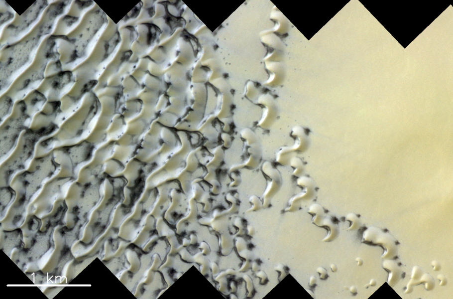 Snímek pořídila kamera CaSSIS (podle anglického Colour and Stereo Surface Imaging System). Je na něm patrné, jak bouřlivá aktivita na roztávajícím světě vytváří černé šmouhy na krémových dunách. Zima na Marsu skončila, v oblasti severního pólu se zvýšila teplota a zimní led taje.