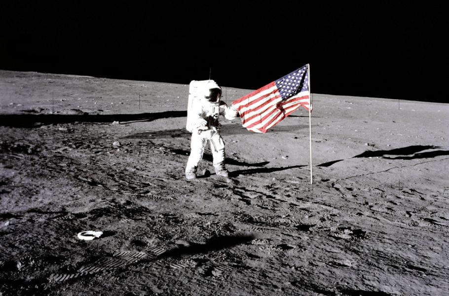 Velitel Apolla 12 Charles „Pete“ Conrad, Jr. s vlajkou Spojených států - 19. listopadu 1969. (foto: Wikimedia Commons, NASA, CC BY 4.0)