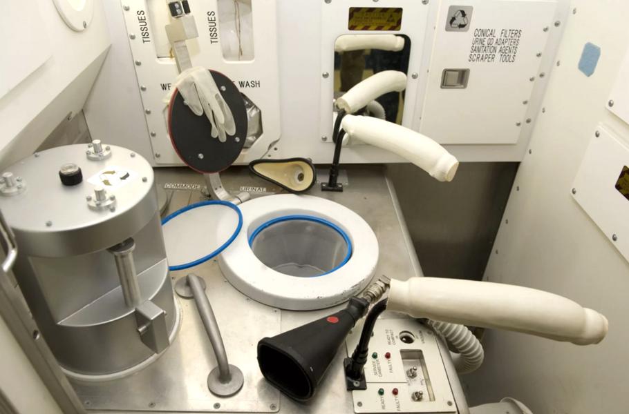 Toalety na Mezinárodní vesmírné stanici pocházejí z dílen ruských inženýrů a jedná se o výjimečná recyklační zařízení, která dovedou tekuté výměšky přefiltrovat zpět do pitné podoby. Aby se kosmonauti v beztížném stavu mohli vyprázdnit co nejpohodlněji, je záchod vybaven také úchyty na nohy a popruhy, zatímco „správné směřování“ exkrementů se zajišťuje sáním vzduchu. Tekutý odpad se sbírá k recyklaci, ten pevný končí ve speciálních pytlících, jež se ukládají do hliníkových nádob a obvykle shoří v zemské atmosféře. (foto: NASA, CC0)
