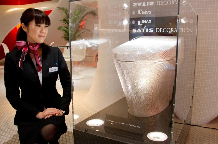 Pokud si bez odlesků Swarovského krystalů nedokážete už ani odskočit, pak právě pro vás japonská společnost Lixil nachystala unikátní toaletu, vykládanou 72 tisíci drahých kamenů. Šperkaři na její výzdobě údajně pracovali celé měsíce a přepočtená cena přesahující 2,8 milionu korun tomu odpovídá. Drahokamy nicméně nepokrývají prkénko a doufejme, že ani vnitřek mísy – jinak by byla poněkud škoda záchod používat. (foto: Profimedia)