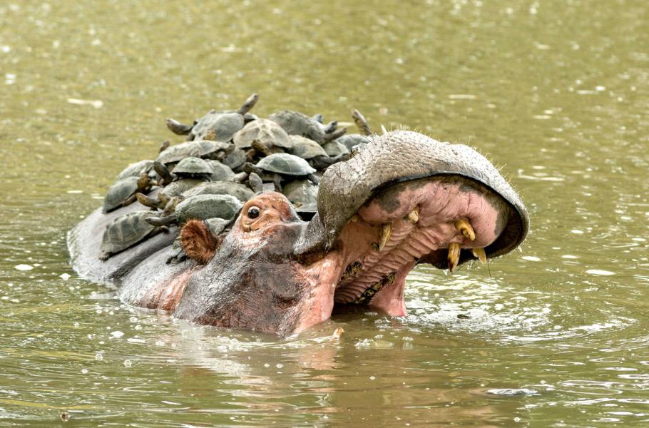 Ne vždy se jízdy na zádech odehrávají se souhlasem obou stran. Skupinka asi dvaceti želv diamantových využila chvilkové zdřímnutí šestiletého hrocha v jihoafrickém národním parku Kruger, aby se mohla nerušeně vyhřívat na sluníčku. Ihned po probuzení však samec projevil nelibost a rázným otřesením nezvané návštěvníky shodil. Scénu zachytil fotograf Adri Botma, který park navštěvuje každých čtrnáct dní a některá zvířata již zná od pohledu.