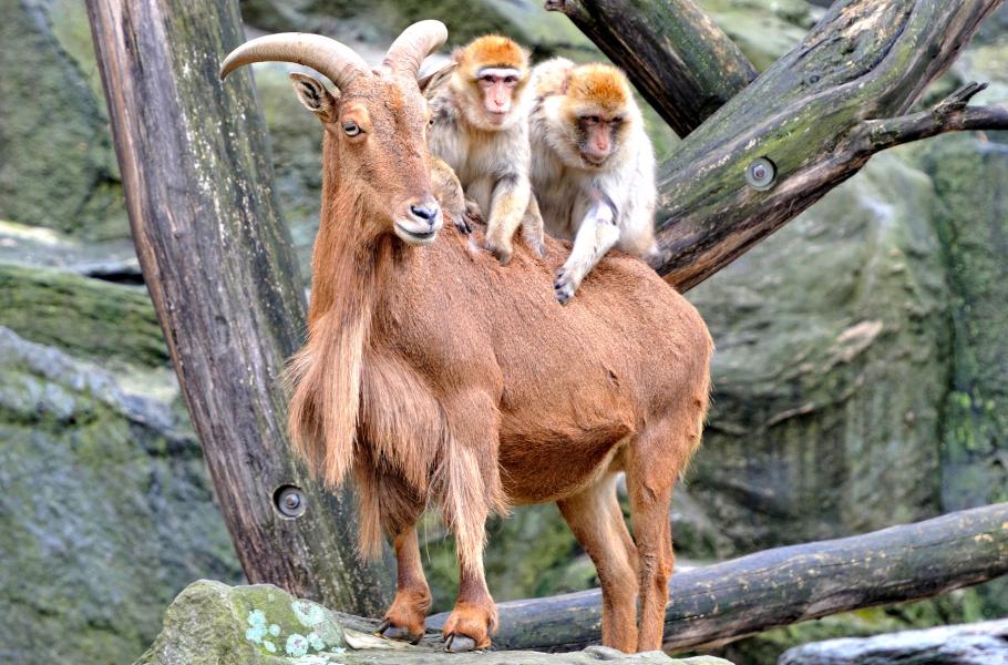 Příjemnou vyhlídku ze zad paovce hřivnaté, žijící v pouštních oblastech severní Afriky, si dopřává párek makaků, kteří jsou doma na jihovýchodě Asie. Jinak neobvyklé setkání umožňuje fakt, že se oba druhy nacházejí ve společném výběhu vídeňské zoo, kde podle autora snímku Josefa Gelertnera tvoří populární magnet na návštěvníky.
