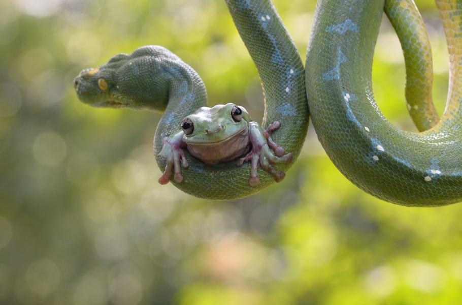 Velmi neobvyklý výjev mezi druhy, které by se ve volné přírodě řadily do kategorií „oběť a predátor“, zachytil Indonésan Fahmi Bhs v jakartské zoo. Tropická žába se nebojácně vydala na výlet po těle krajty zelené, jež si hověla v listech kokosové palmy. Podle fotografa prý oba tvorové žijí v zoologické zahradě mírumilovně vedle sebe.