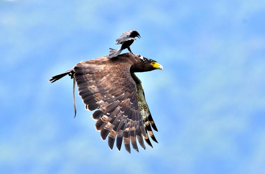 Bitvu spíš humorného charakteru zvěčnil tchajwanský fotograf LIu Chia-Pin, když pořizoval snímky přírody nedaleko metropole Tchaj-pej. Drobný pták z čeledi drongovitých, kteří navzdory malému vzrůstu prosluli agresí i vůči největším dravcům, si počíhal na orlíka chocholatého, s rozpětím křídel až 1,5 metru. Opeřený gigant ulovil hada a chystal se k poklidné svačině, ovšem drongo se mu ji pokusil ukrást. Nicméně neuspěl, a tak během krátké jízdy na jeho zádech uštědřil soupeři alespoň bolestivý „pohlavek“.