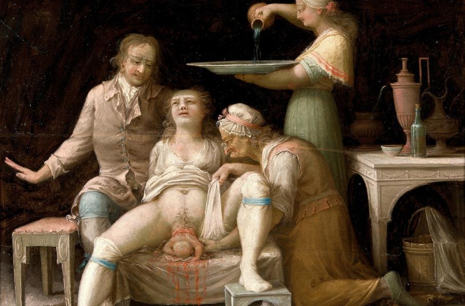 Porodní scéna od neznámého malíře kolem roku 1800. (ilustrace: Wikimedia Commons, Wellcome Collection gallery, CC BY 4.0)