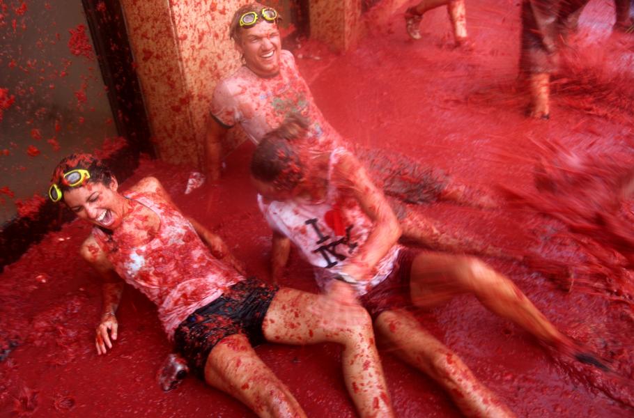 Tisícihlavý dav a ulice zbarvené do ruda, to je každoroční obrázek srpnové slavnosti La Tomatina, odehrávající se ve španělském městečku Buñol nedaleko Valencie. Za vznikem slavnosti přitom stála kuriózní nehoda. V roce 1945 došlo během průvodu masek (Gigantes & Cabezudos) k nehodě, která vyvrcholila hádkou a divokou strkanicí, jíž nebyl ušetřen ani nedaleko stojící stánek se zeleninou. Příštího roku už na náměstí Buñolu dorazili lidé vyzbrojení vlastní rajčatovou municí a položili tak základ rajčatové války zvané La Tomatina. (foto: Wikimedia Commons, flydime, CC BY-SA 2.0)