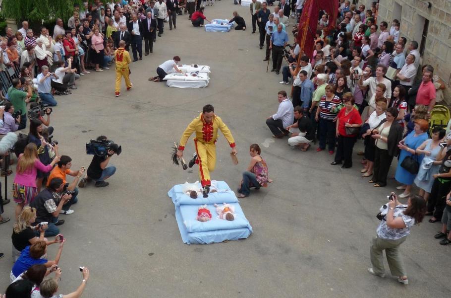 El Salto del Colacho, neboli ďábelský skok, je tradiční španělský svátek, který se každoročně koná v městečku Castrillo de Murcia, ležícímu 100 kilometrů severně od Madridu. Tradice tohoto svátku sahá až do roku 1620 a každoročně se koná u příležitosti katolického svátku Těla a Krve Páně. Běžci symbolizující ďábla přeskakují nemluvňata, aby je tak očistili od jejich prvotního hříchu. (foto: Wikimedia Commons, Celestebombin, CC BY-SA 4.0)