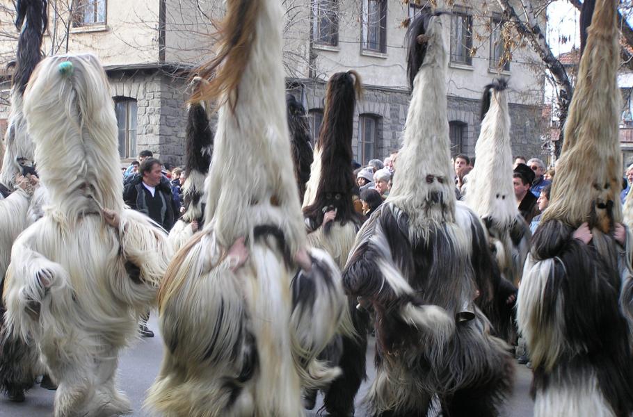 Kukeri je tradiční bulharský rituál oslavující jaro. Odehrává se obvykle kolem počátku roku a před postní dobou, kdy kukeri (božství ztělesňující plodnost) chodí a tancují vesnicí, aby vyplašili zlé duchy s pomocí svých komplikovaných kostýmů a zvuku zvonů. Cílem je zajistit vesnici dobrou sklizeň, zdraví a spokojenost. (foto: Wikimedia Commons, Ivaneskoto, CC0)