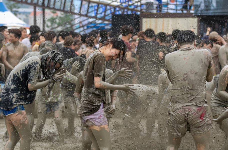 Jihokorejské město Boryeong, ležící na pobřeží Žlutého moře, je každý rok během druhého červencového víkendu svědkem neobvyklého sportovního svátku. Miliony diváků zde sledují zápasy v bahnem naplněných bazénech a bahenní lyžařské závody. Svátek byl původně marketingovou akcí, která měla upozornit na léčivé a zkrášlující účinky kosmetiky, vyráběné z bahna zdejších mokřin. (foto: Shutterstock)