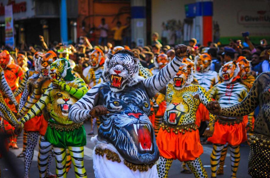 Tygr je v Indii považován za mýtické zvíře, ostatně sedlá jej například hinduistická bohyně Durga, jedna z manželek boha Šivy. V indické provincii Kérala se již přes 200 let koná slavnost Puli Kali, tedy tygří hry. Puli Kali je svého druhu karneval, při němž městem Thrissur prochází rej tygřích masek všech velikostí a barev. (foto: Wikimedia Commons, Gokuldasks, CC BY-SA 4.0)