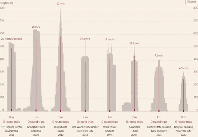 Při stavbě mrakodrapu nejde jen o to, aby budova nespadla, neméně důležitý je i způsob jak se do ní budou dostávat lidé. Financial Times sestavil tuto skvělou infografiku, která ukazuje, jak rychlé jsou výtahy v nejvyšších budovách světa