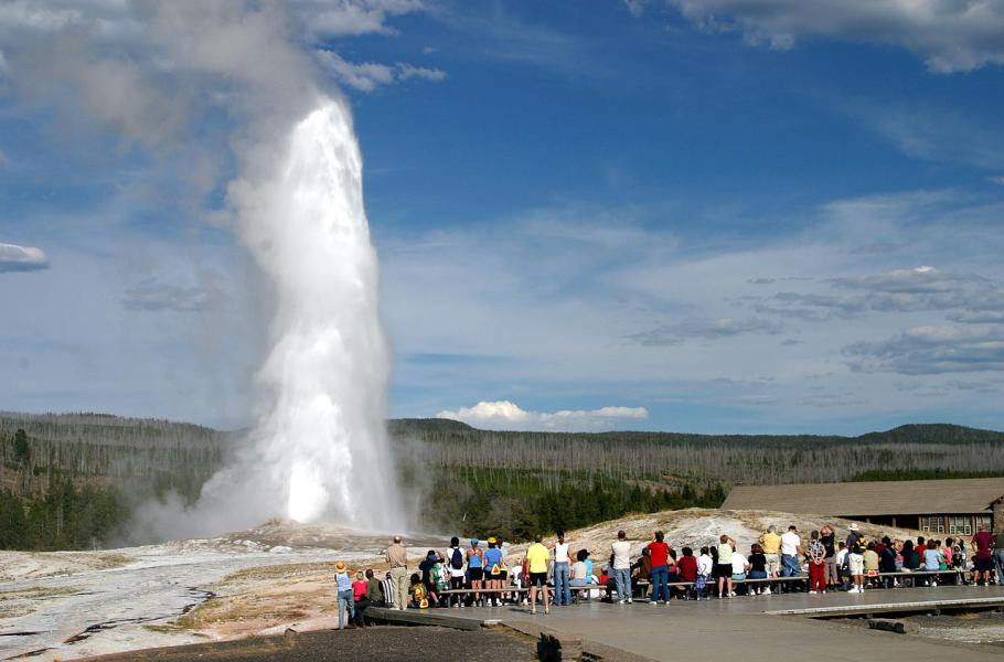 Proslulý gejzír Old Faithful (česky „Starý spolehlivec“) v národním parku Yellowstone.