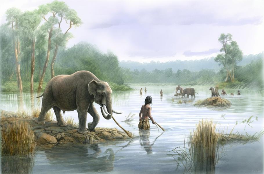 Lidé druhu Homo heidelbergensis žili ve středoevropské jezerní krajině se slony a nosorožci. (ilustrace: Midjourney AI, CC0)