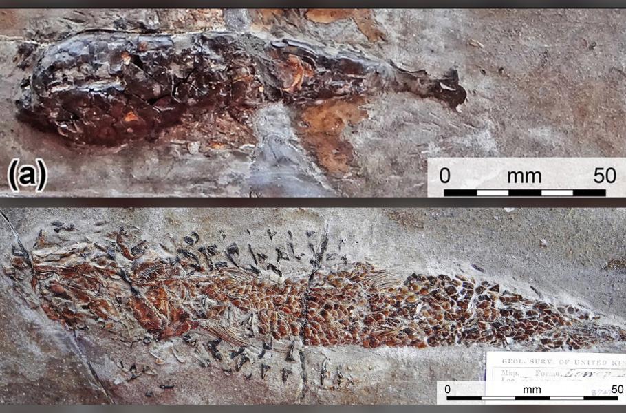 Zkamenělina Clarkeiteuthis montefiorei (nahoře), detail fosilie nešťastné ryby Dorsetichthys bechei (dole).