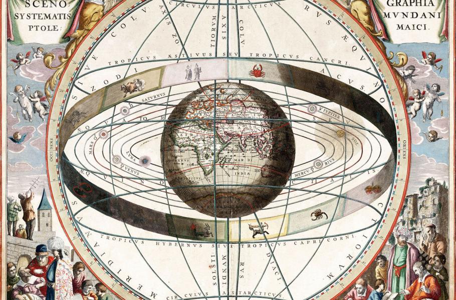 Ptolemaiův kosmický systém se Zemí uprostřed. Vydáno v Amsterodamu v roce 1660 (s tehdejší aktuální mapou světa)