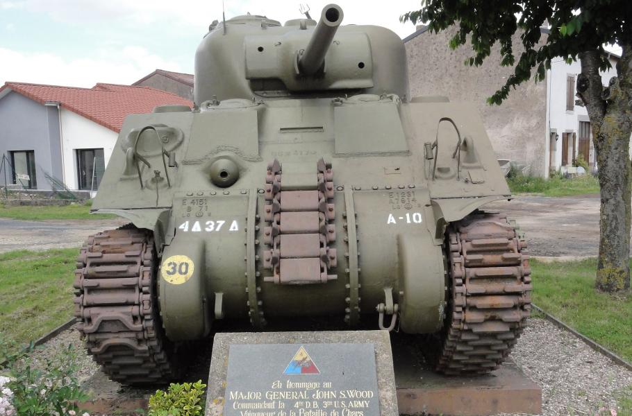 Americké vítězství dnes připomíná památník v podobě tanku Sherman a desky věnované veliteli 4. obrněné divize generálmajorovi Johnu S. Woodovi. (Wikimedia Commons, Havang, CC0 1.0)