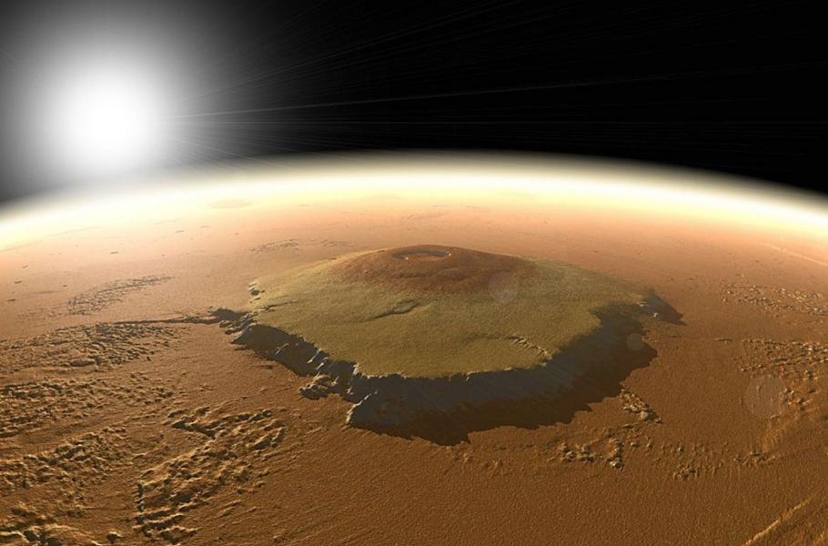 Dávný štítový vulkán Olympus Mons se na Marsu tyčí do výšky 21,9 kilometrů. Jde o nejvyšší horu a také nejvyšší vulkán Sluneční soustavy. Vedle impozantní výšky ohromuje i svou rozlohou, která je téměř stejná, jako celková rozloha Polska.
