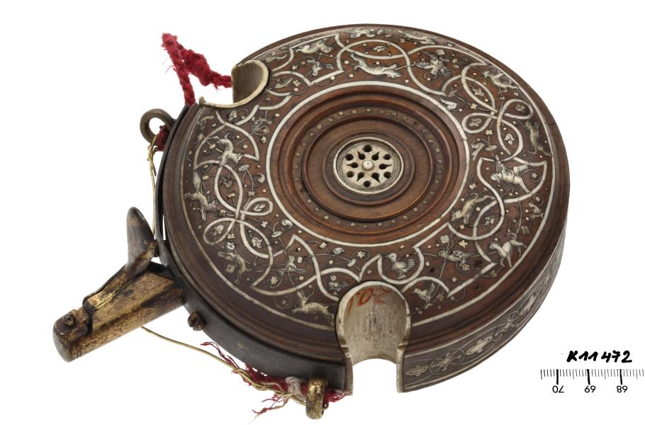 Tato kruhová dřevěná prachovnice se používala v dobách renesance ve střední Evropě. Střed je (stejně jako ornament) zhotoven z hladké kosti, výsypka je zlacená