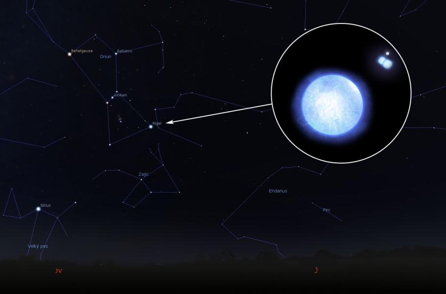 Astronomové řadí Rigel A do spektrální třídy B8. Je asi 20krát hmotnější než Slunce, což mu zaručuje budoucnost supernovy, a svítivostí naši hvězdu předčí dokonce 81 000krát. Povrchová teplota obra dosahuje 12 100 K a jeho stáří se odhaduje na pouhých 7–9 milionů roků. (foto: Stellarium, Wikimedia Commons, Pablo Carlos Budassi, CC BY-SA 4.0)