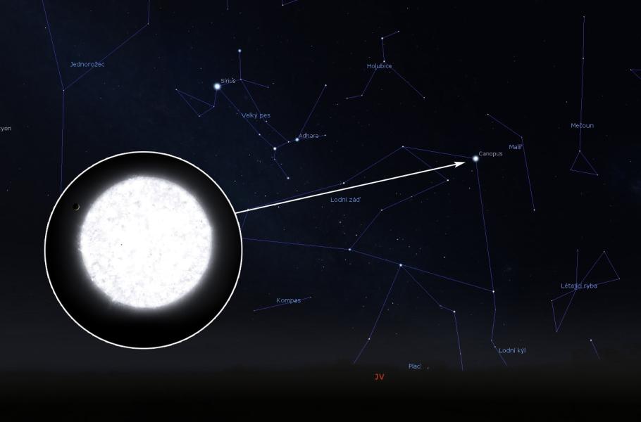 Žlutobílého obra dělí od Země 310 ly. Astronomové ho řadí do spektrální třídy F0, je tedy nepatrně teplejší než Slunce a zhruba osmkrát hmotnější. Průměrem ovšem naši hvězdu převyšuje 71krát a je také mnohem starší. Jeho povrchová teplota byla určena na 7 400 K a zářivým výkonem atakuje 10 700násobek Slunce. Canopus často sloužil k orientaci a navigaci sond směřujících k planetám naší soustavy. (foto: Stellarium, Wikimedia Commons, Pablo Carlos Budassi, CC BY-SA 4.0)
