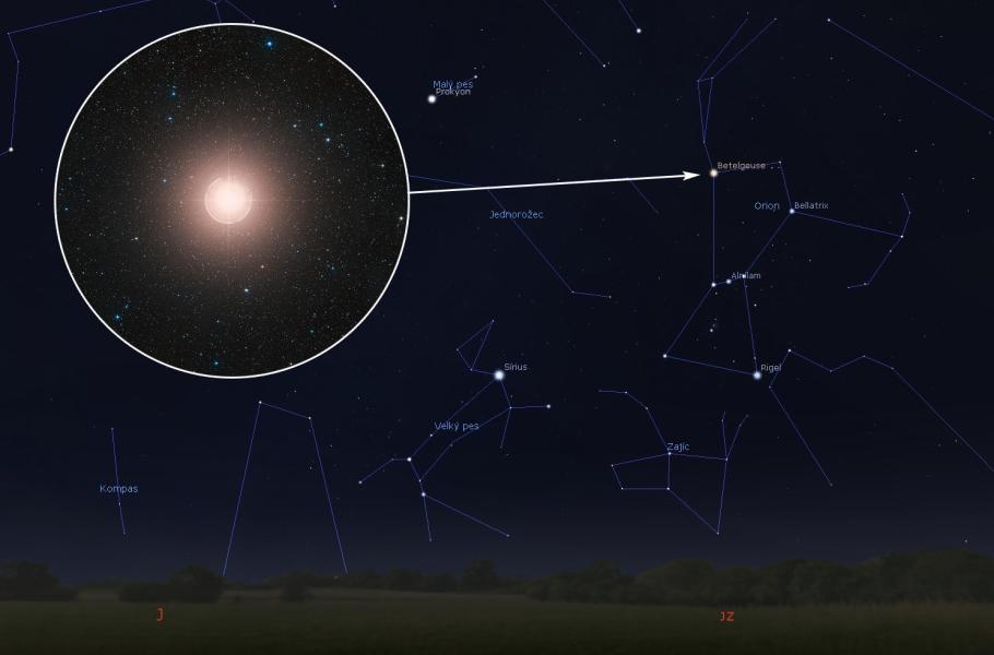 Obr Betelgeuze leží 640 ly od Země a jeho oranžovočervenou tvář lze snadno rozeznat pouhýma očima. Na obloze jej najdeme v místě pravého ramene lovce Oriona, coby druhou nejjasnější stálici zmíněného souhvězdí.