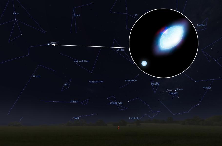 Od Země dělí modrobílou stálici 139 ly a podle spektrální klasifikace se řadí do třídy B6. Ve skutečnosti jde o dvojhvězdu, jejíž jasnější složka dosahuje 6,7násobku hmotnosti Slunce a 7,3násobku jeho průměru. Vzhledem k rotaci extrémní rychlostí 250 km/s je Achernar velmi zploštělý, podobně jako Vega. (foto: Stellarium, Wikimedia Commons, Pablo Carlos Budassi, CC BY-SA 4.0)