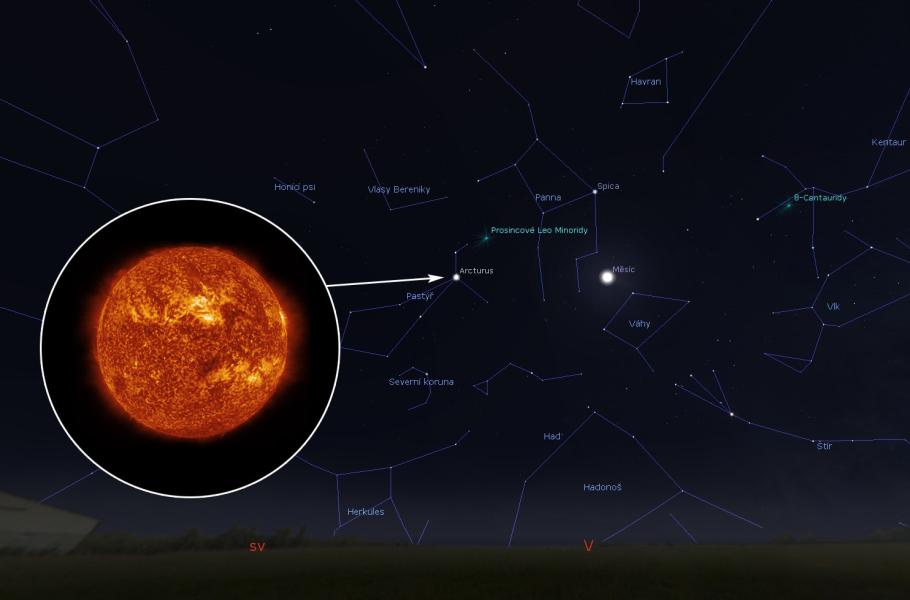 Hlavní složka souhvězdí Pastýře, s vizuální magnitudou −0,05, tvoří nejnápadnější stálici jarní oblohy. Oranžový obr Arcturus se nachází 36,7 ly od naší planety a odborníci ho řadí do spektrální třídy K0, což mimo jiné znamená, že je nepatrně chladnější než Slunce. Jeho stáří bylo určeno na 7,1 miliardy roků, dosahuje 1,08 hmotnosti naší hvězdy, ale v porovnání s ní je 25krát větší a 170násobně svítivější.