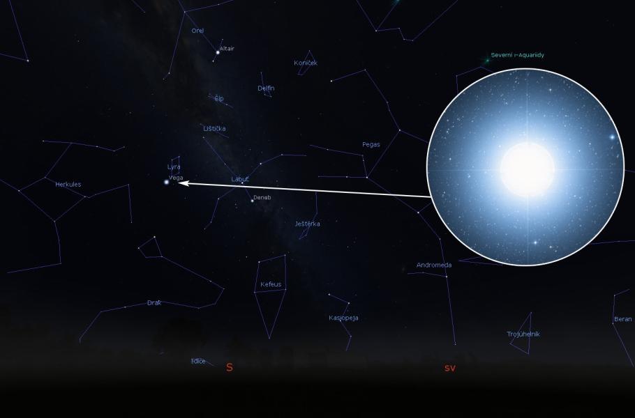 Astronomové zjistili, že hvězdu obklopuje prstenec hmoty: V roce 2005 jej v oboru infračerveného záření objevila observatoř NASA s názvem Spitzer. V porovnání se Sluncem je Vega 2,1krát hmotnější, 2,4krát větší a 40násobně svítivější. Má značně eliptický tvar a její povrchová teplota dosahuje 9 600 K. Po opuštění hlavní posloupnosti na Hertzsprungově–Russellově diagramu se promění v rudého obra spektrální třídy M a po odvržení značného množství materiálu skončí jako bílý trpaslík. (foto: Stellarium, Wikimedia Commons, Morigan221, CC BY-SA 3.0)