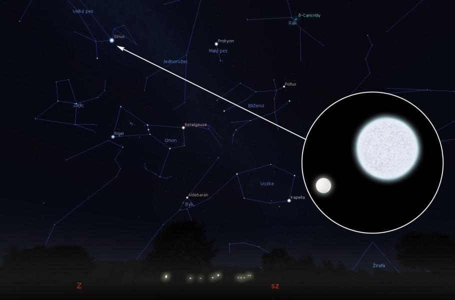 Ve skutečnosti se jedná o dvojhvězdu s velmi jasnou primární složkou Sirius A a se slabým průvodcem, bílým trpaslíkem označovaným jako Sirius B. Ačkoliv se hmotnost druhého zmíněného téměř shoduje se Sluncem, jeho povrchová teplota činí 25 000 K, zatímco v průměru měří asi jen 12 000 km. Kolem hlavní složky obíhá po eliptické dráze ve vzdálenosti 8,2–31,5 AU (astronomické jednotky), s periodou 50 let. (foto: Stellarium, Wikimedia Commons, Pablo Carlos Budassi, CC BY-SA 4.0)
