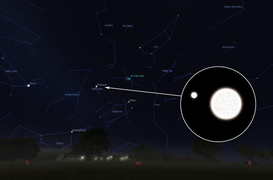 Ve skutečnosti jde o dvojhvězdu: Hlavní složka, žlutobílý podobr Prokyon A, se klasifikuje jako spektrální typ F5 a je nepatrně chladnější než Slunce. Dosahuje 1,5násobku jeho hmotnosti a průměrem jej dvakrát převyšuje. Výrazně menší průvodce oběhne hlavní hvězdu jednou za 41 roků. Jedná se o bílého trpaslíka označovaného jako Prokyon B, s 0,6násobkem hmotnosti Slunce, ale pouze s 0,012násobkem jeho průměru. Tato velmi slabá stálice vyzařuje 0,00049 slunečního výkonu. (foto: Stellarium, Wikimedia Commons, Pablo Carlos Budassi, CC BY-SA 4.0)