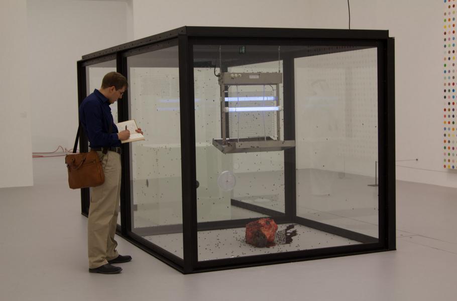 Jeho dílo „A Hundred Years“ podle umělce představuje „uzavřený životní cyklus“ – v jedné části skleněného boxu se z vajíček a larev rodí mouchy, které po průletu do druhé části hynou vlivem záření UV lampy. Damien Hirst platí za kontroverzního umělce, který ve svých instalacích nezřídka využívá mrtvá zvířecí těla. Jiná z verzí jeho instalace („A Thousand Years“) obsahovala navíc kravskou hlavu. Známé jsou i Hirstovy instalace zvířat – koně, krávy, žraloka – naložených do formaldehydu.