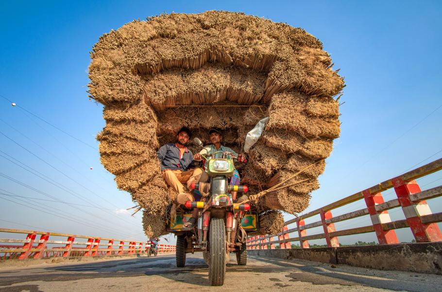 Bangladéšští farmáři zvládají na motorové tříkolce přepravit ohromné množství jutového proutí, a to třeba i na vzdálenost 25 kilometrů. V místě určení pak přeskládají třímetrovou haldu na nákladní vozidla, jež směřují do továren na dřevotřísku. Za tunu materiálu dostanou farmáři v přepočtu 4 500 korun. Jutový průmysl patří k největším hospodářským odvětvím v zemi, a navíc má dlouhou tradici. Juta bývala dokonce hlavním vývozním artiklem, přestože ke konci minulého století její export poklesl. Bangladéš však stále pokrývá třetinu světové poptávky. (foto: Profimedia)